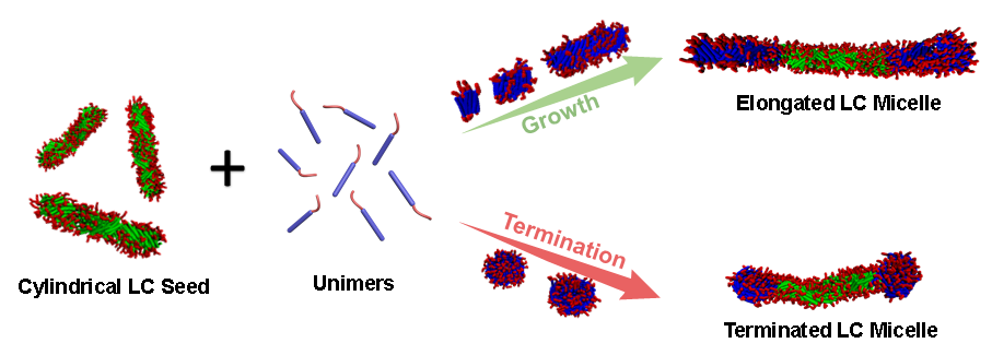 In this research work, cylindrical micelles with cholesteric liquid crystal cores are used as seeds. After adding block copolymers, the copolymers form new aggregates, and the seed micelles undergo epitaxial growth after fusing with the seeds. During this growth process, the rigid segments in the aggregate rearrange, so that the living ends maintain the cholesteric liquid crystal arrangement consistent with the seed cores. Therefore, the fluidity of liquid crystals is the key to this growth behavior. In addition, when the interactions between rigid liquid crystal blocks are stronger, and after the aggregates are fused with the seeds, the living ends have the characteristic of the smectic liquid crystal arrangement. At this time, it is difficult for the segments to rearrange and adjust back to the cholesteric liquid crystal arrangement. Therefore, the weak rearrangement ability finally terminates this growth behavior. The research work reported the regulation method of liquid- crystallization-driven self-assembly to realize the controllable growth and termination of micelles, revealed the key driving mechanism of liquid crystal fluidity and reported the termination behavior of micelle controlled growth for the first time, which provided an in-depth understanding and theoretical reference for the controllable self-assembly of copolymers and the accurate construction of nanostructures.