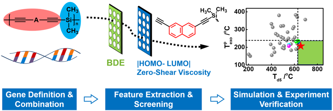 最近,华东理工大学林嘉平教授团队在耐高温树脂的设计方法上取得了突破,建立了适用于高性能聚合物设计的材料基因组方法,大大加快了树脂的研发速率,有望改变以试错为主的传统材料设计方法。该工作以“Rational Design of Heat-Resistant Polymers with LowCuring Energies by a Materials Genome Approach”为题发表在材料化学领域重要刊物Chem.Mater. (DOI:/10.1021/acs.chemmater.0c00238)。发展的材料基因工程方法包含基因定义、收集与组合、性能预测、结构筛选、性能验证等步骤。